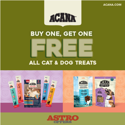 Buy any ACANA Dog Chewy Strips, Jerky Bites, Freeze-Dried Treats, or ACANA Cat Lickables, Get 1 FREE!