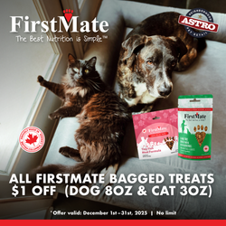Save $1.00 on FirstMate Limited Ingredient 8oz Dog Treats & 3oz Cat Treats!