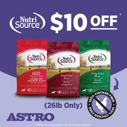 Save $10.00 on 26lb bags of NutriSource Beef & Rice, Large Breed Beef & Rice, and Turkey & Rice that are now Chicken Free formulas!