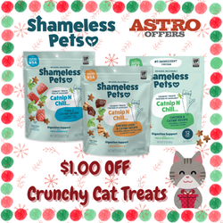 Save $1.00 on Shameless Pets Crunchy Cat Treats including Catnip N Chill Chicken, Catnip N Chill Tuna, Catnip N Chill Chicken Liver, Yam Good Salmon and Cran U Say Chicken!