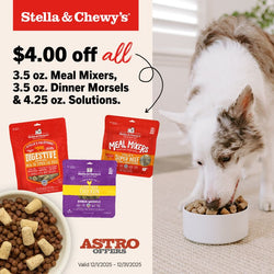 Save $4.00 on all 3.5oz Meal Mixers, 3.5oz Dinner Morsels for cats, and 4.25oz Stella Solutions 4.25oz Trial Bags