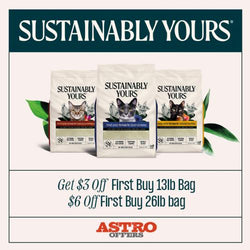 First time Sustainably Yours buyers can save $3.00 on a 13lb bag OR $6.00 on 26lb bag of litter and start earning punches on their Frequent Buyer Card!