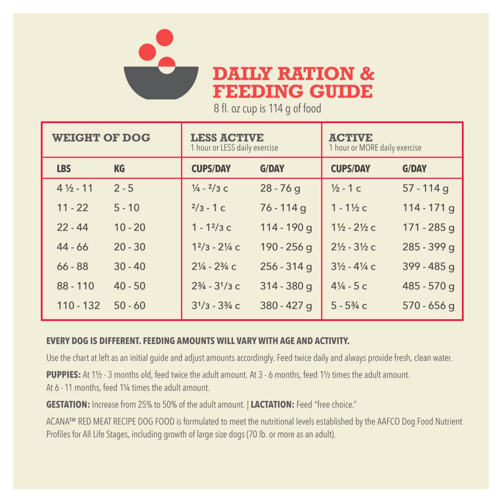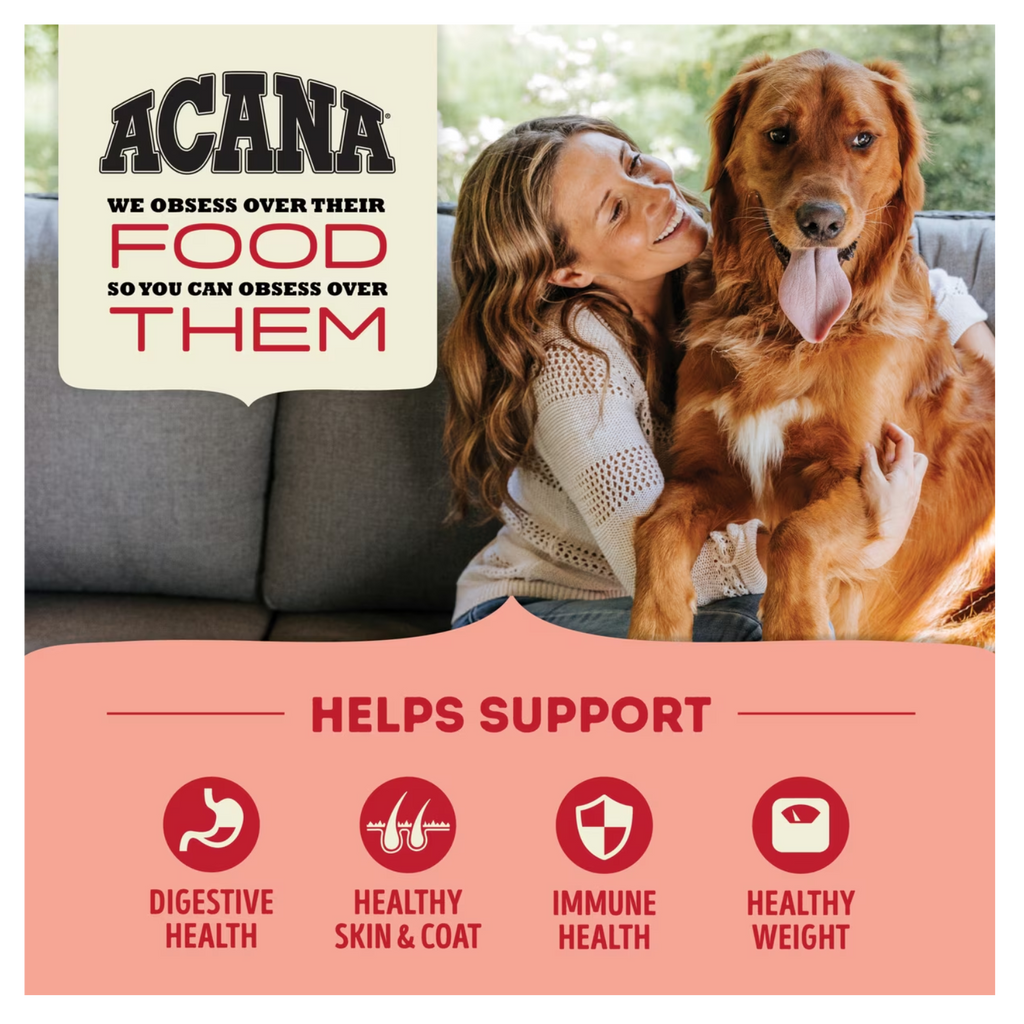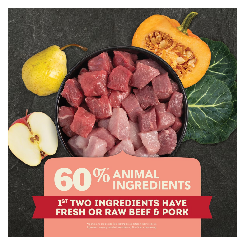 Bring home the quality nutrition your dog needs with ACANA™ Red Meat Recipe. Protein-rich, Fresh or Raw Farm-Raised Beef, Yorkshire Pork & Raw Lamb are balanced with whole pumpkin, collard greens, apples and pears to offer a delicious, nutritious option for your dog. This ACANA dog food is 60%1 animal ingredients and 40%2 fruits and vegetables. Antioxidant-rich ingredients plus added Vitamin E help support a healthy immune system, and naturally occurring Omega-3 and Omega-6 fatty acids help support healthy skin and shiny coat. Even better, this dry dog food with no added grains has a freeze dried coating made of beef, pork and lamb for a delicious taste your dog will crave. Choose ACANA dry dog food kibble to give your companion the nutritional foundation they need to live a happy, healthy life.