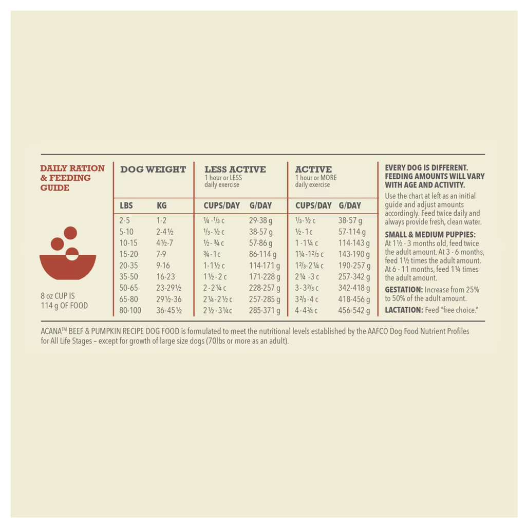ACANA™ Singles Limited Ingredient Diet Recipes are rich in protein from a single animal source, making them perfect for choosy dogs. Our Beef & Pumpkin recipe is crafted with 65% animal ingredients1 from protein-rich beef including raw beef and beef liver to satisfy your dog’s cravings, and it contains no grain ingredients2. It’s also balanced with nutritious, fiber-rich vegetables and fruit including whole pumpkin to help support your dog’s digestive health. Show your dog that a limited ingredient diet doesn’t mean less meat by feeding them ACANA Singles Limited Ingredient Diet Beef & Pumpkin Recipe!