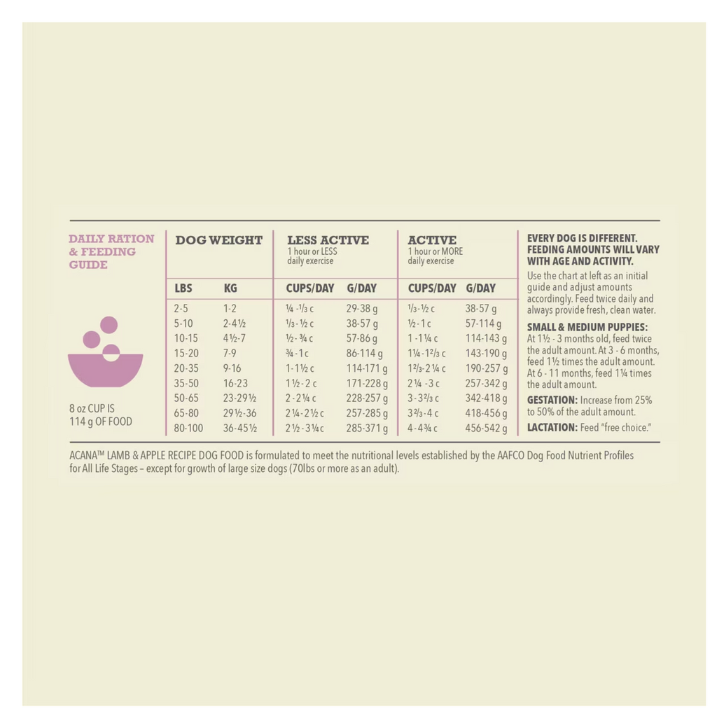 ACANA ™ Singles Limited Ingredient Diet Recipes are rich in protein from a single animal source, making them perfect for choosy dogs. Our Lamb & Apple recipe is crafted with 65% animal ingredients1 from protein-rich lamb including raw lamb and lamb liver to satisfy your dog’s cravings, and it contains no grain ingredients2. It’s also balanced with nutritious, fiber-rich vegetables and fruit including whole apples to help support your dog’s digestive health. Show your dog that a limited ingredient diet doesn’t mean less meat by feeding them ACANA Singles Limited Ingredient Diet Lamb & Apple Recipe!