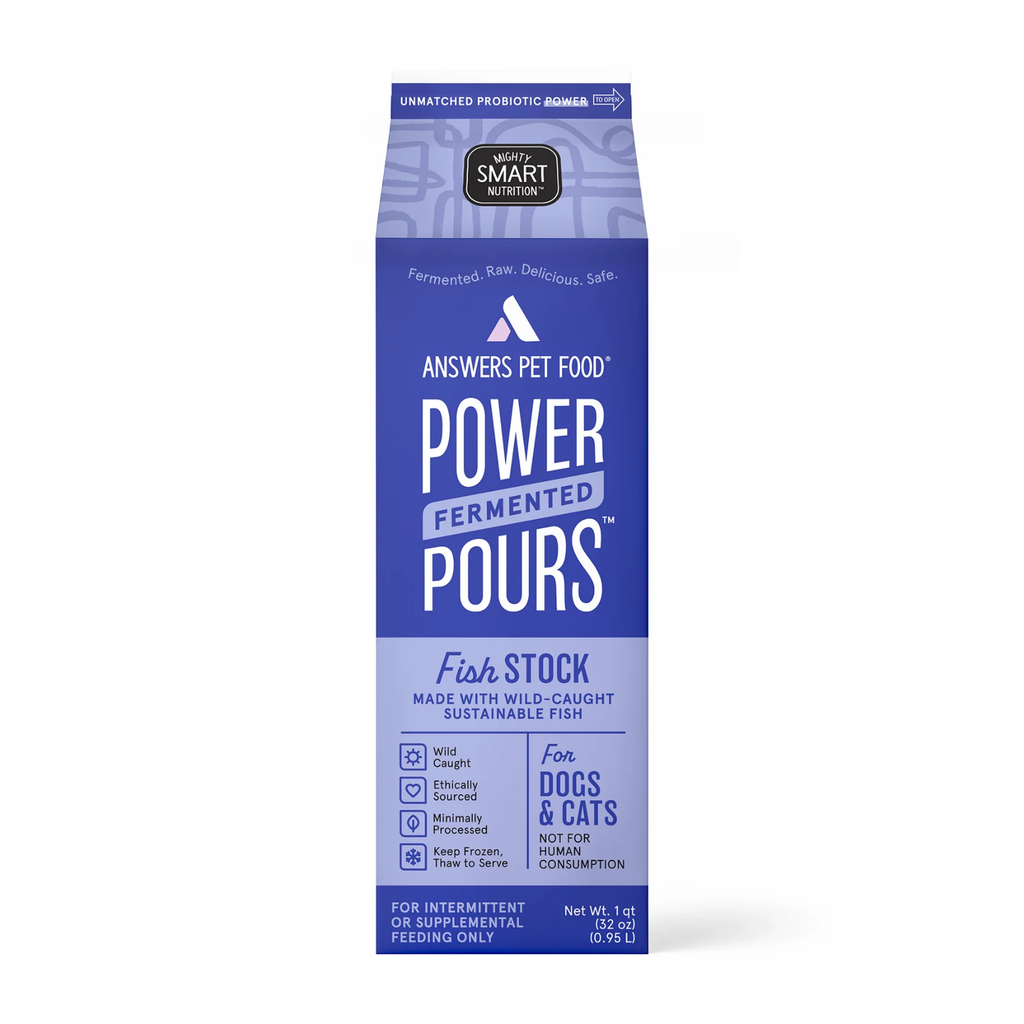 Power Pours Fermented Fish Stock is a unique blend of wild-caught sustainable fish and fermented raw ingredients that adds a power punch of omega 3s, collagen, and probiotics to your pet's daily routine that will help with gut, heart, skin, and coat health. A powerful superfood with complex nutrients, our Fish Stock is sustainably and responsibly sourced, has easy-to-digest proteins, highly absorbable enzymes, and naturally occurring vitamins and minerals. Stop fishing for ways to better your pet's health and start adding our Fermented Fish Stock to your pet's daily routine.