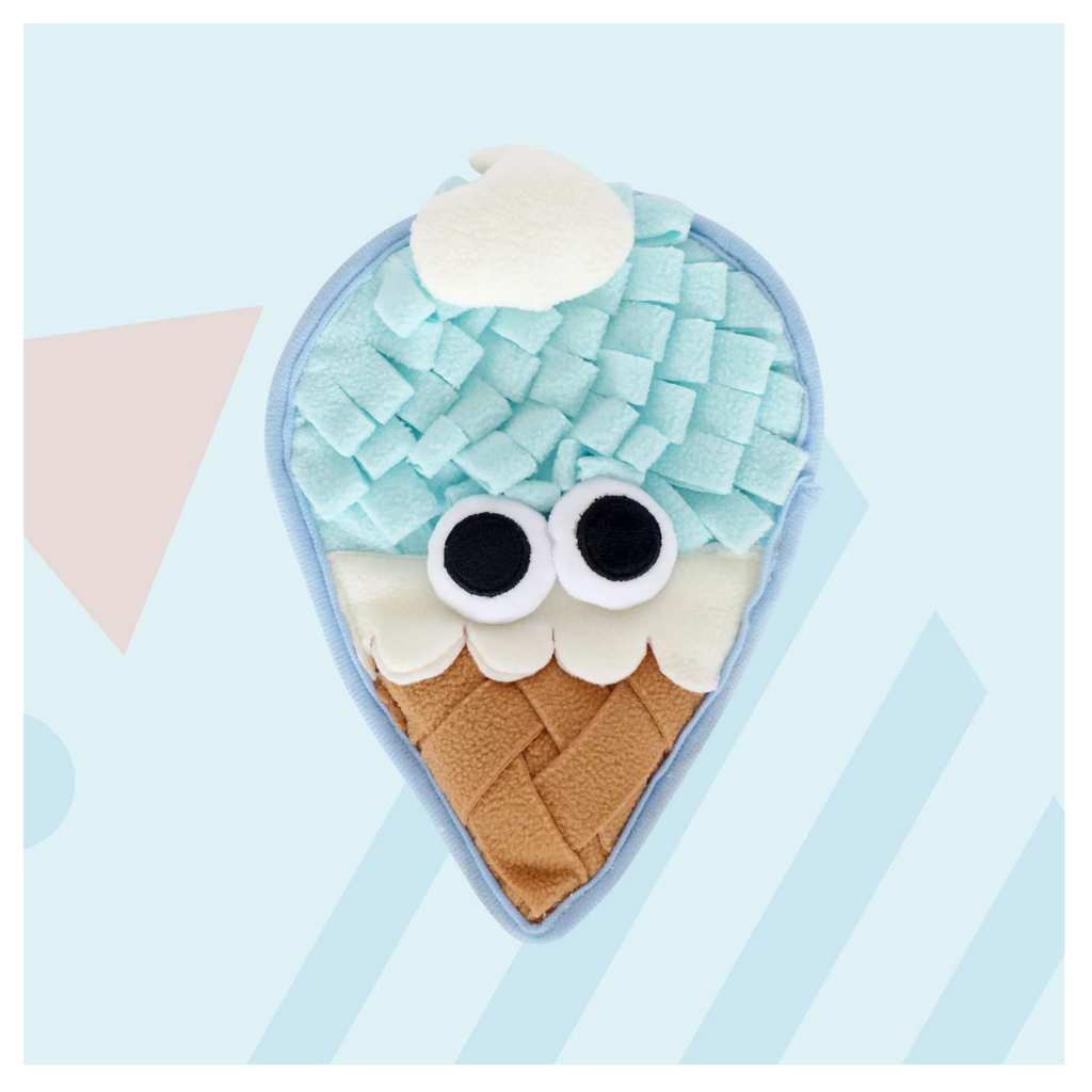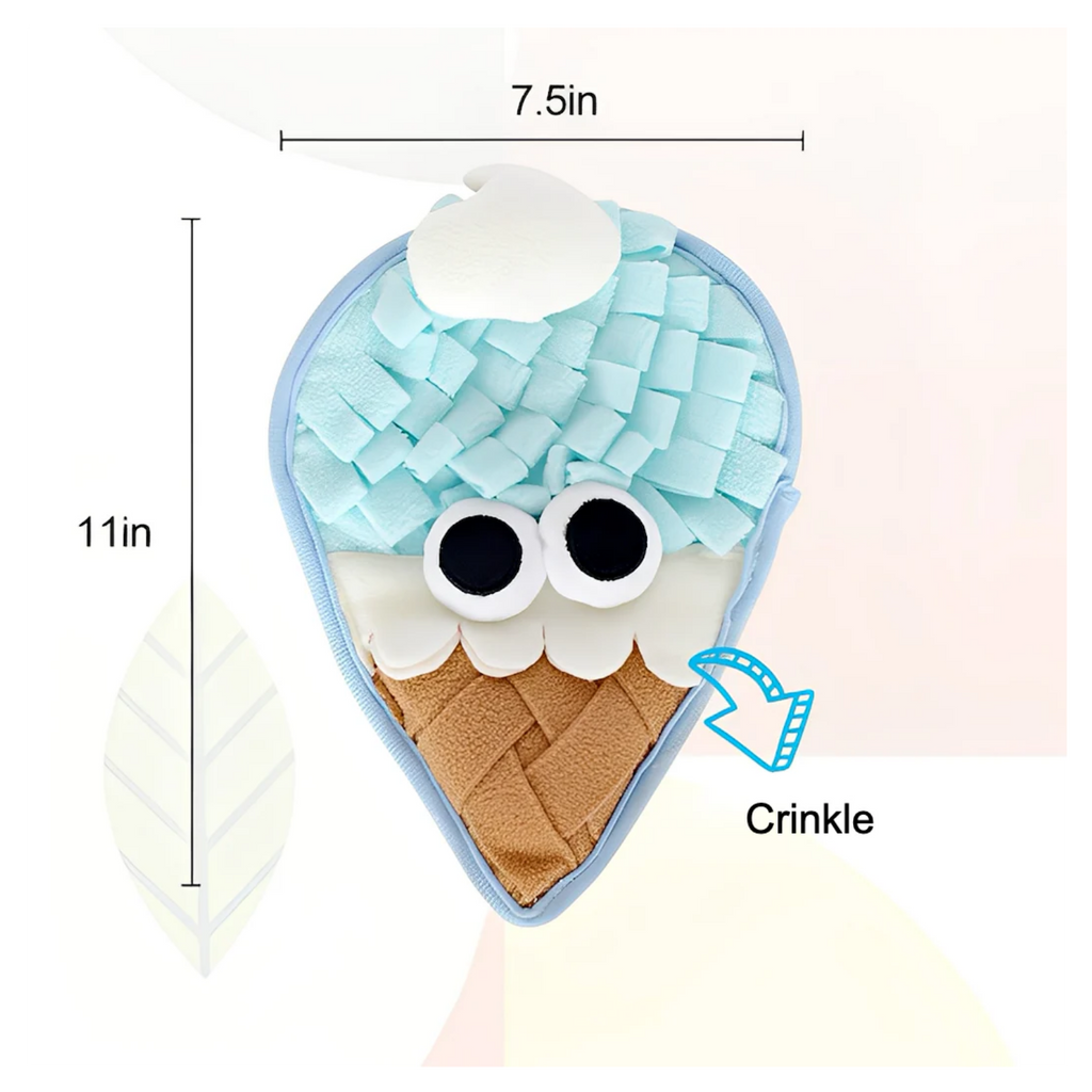 Too cute to eat but built for sniffing, this ice cream snuffle toy brings focused enrichment to play. Soft fleece folds hide treats and encourage foraging, while a crinkle layer in the base adds playful sound to keep dogs curious and engaged. Lightweight with a cheerful cartoon face, it supports short interactive sessions and calmer scent work.