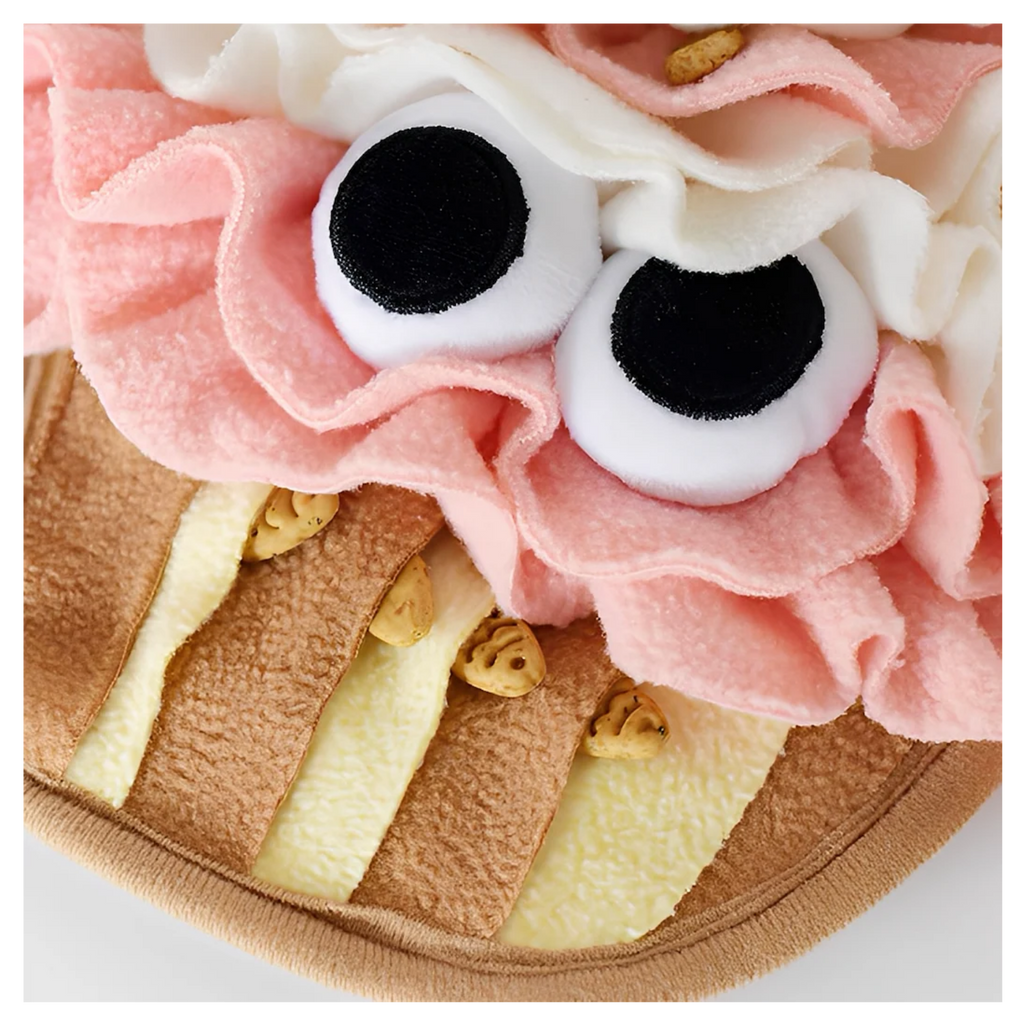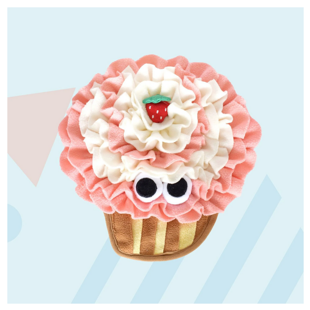 Fluffy strawberry snuffle toy for small dogs and snuffle toy for cats that enjoy foraging and slower feeding. Cupcake-style fleece folds hide treats while a crinkle cone base and optional squeaker add sound to reward exploration.