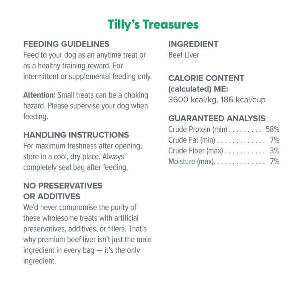 That’s why Tilly’s Treasures are only made from one single ingredient: 100% premium beef liver. Each batch is freeze-dried at peak freshness for a delicious flavor and texture that even picky dogs love.