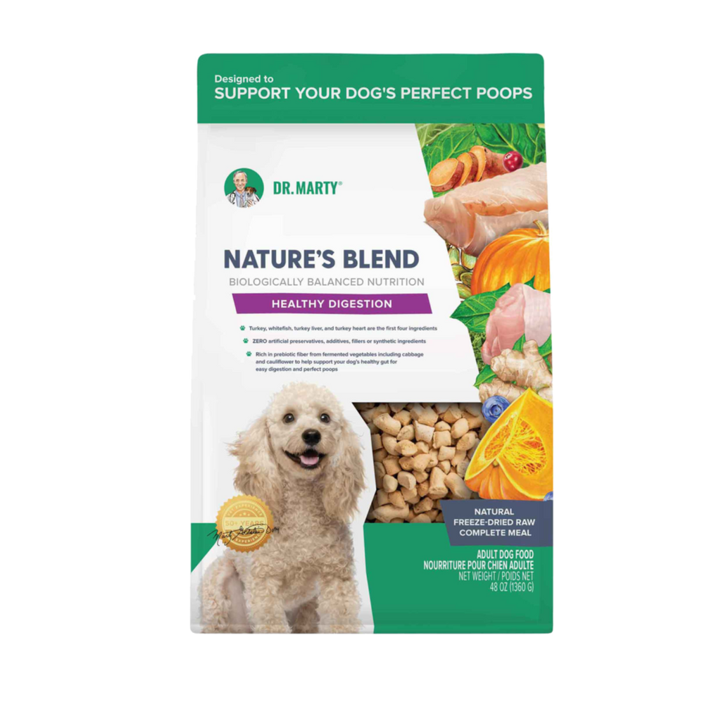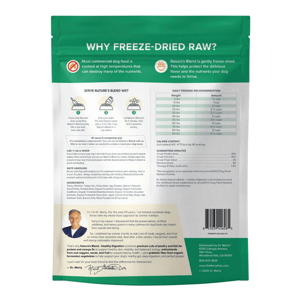 Dr. Marty Nature’s Blend – Healthy Digestion is a premium, freeze-dried raw dog food designed to support your dog’s healthy gut. It combines premium meat, antioxidant-rich seeds and fruit, and fermented vegetables to promote your dog’s smooth digestion, balanced gut, and “perfect” poops… with ZERO artificial preservatives, additives, or synthetic ingredients.