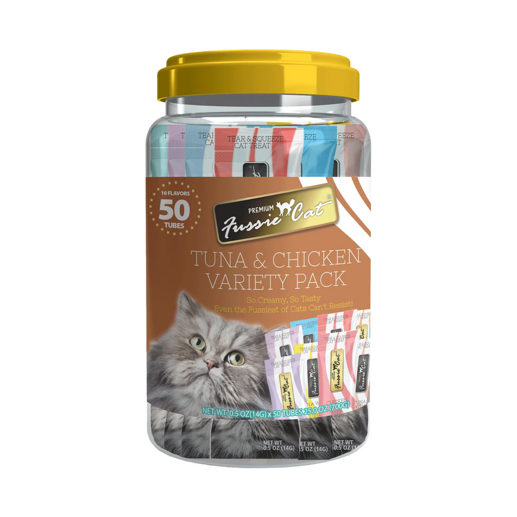 Fussie Cat Tuna & Chicken 10 Flavors Variety Lickable Cat Treats are the ultimate lickable treat experience for your feline friend. And, thanks to this handy tub, you’ll always have your kitty’s favorite flavors available. Whether your furbaby craves fish or poultry, this variety pack has a range of Fussie Cat’s most popular flavors to satisfy even the pickiest eaters. These treats are made with premium animal and fish protein, have up to 86% moisture to support daily hydration, and have a smooth and creamy texture that’s purr-fect for enrichment, interactive bonding, or as a meal topper. Plus, they’re formulated without grain for a healthier snack option.