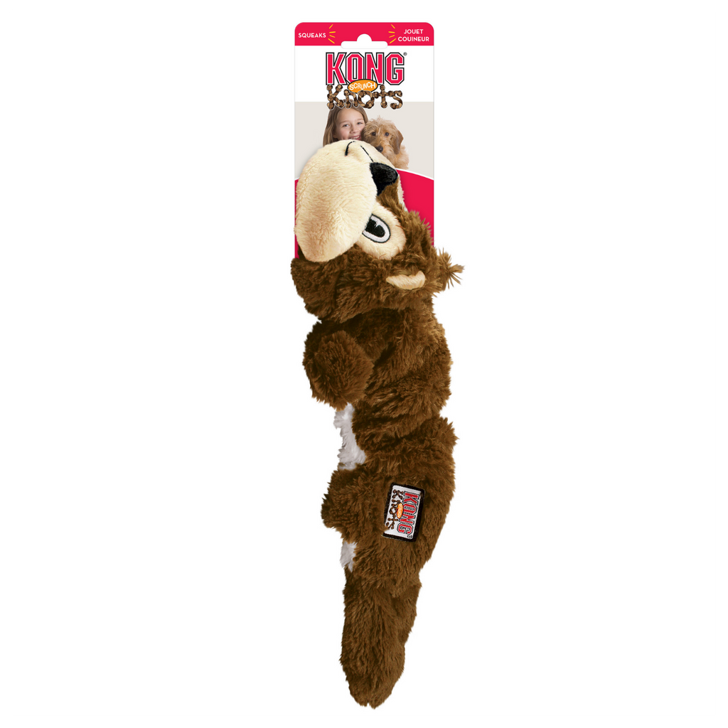 KONG Scrunch Knots are realistic pet toys that keep dogs coming back for more. Plush material scrunches around the internal coiled rope, while stretchy sides create natural movement to entice play. The internal knots satisfy natural instincts and these toys contain no stuffing for less mess. Squeaks for added enjoyment!