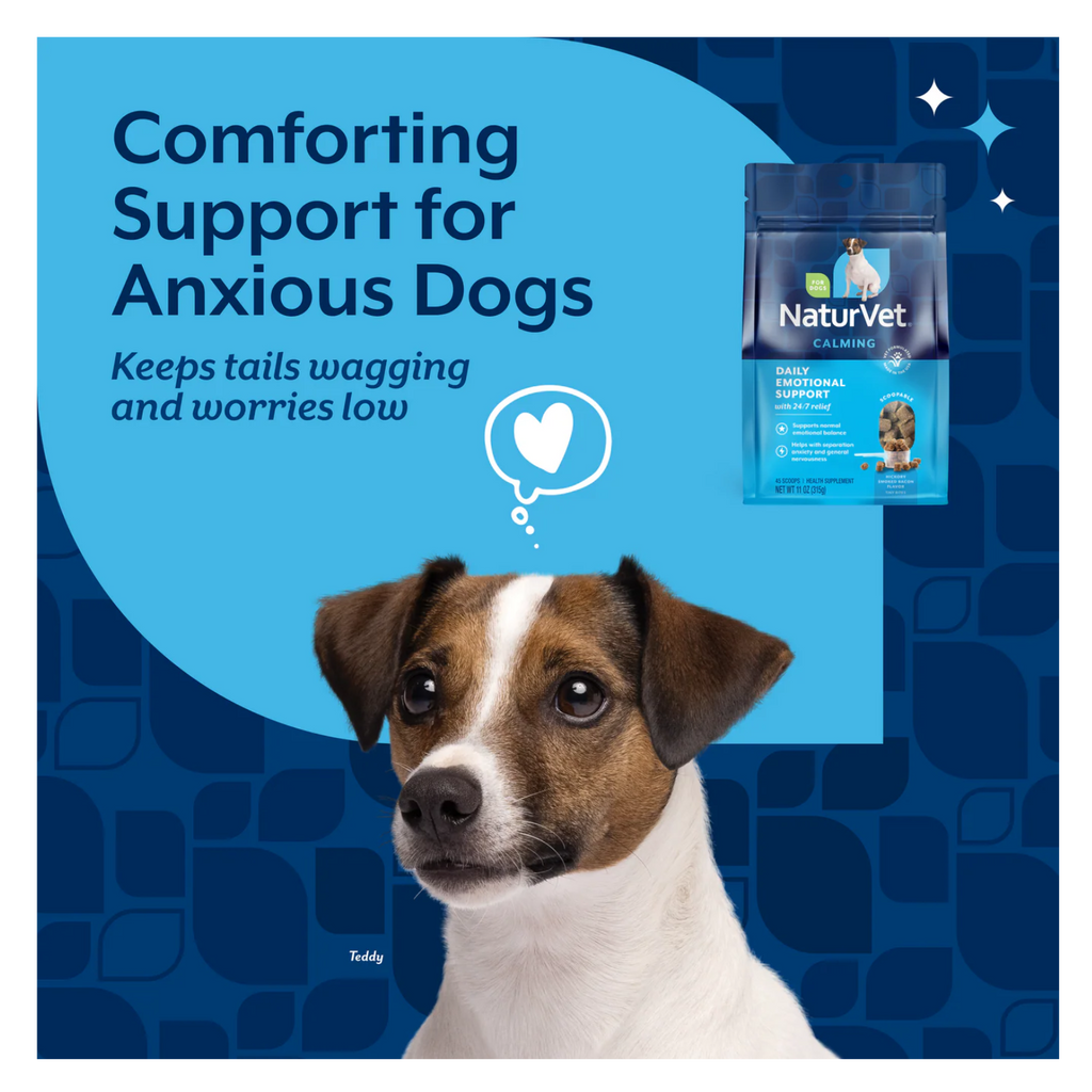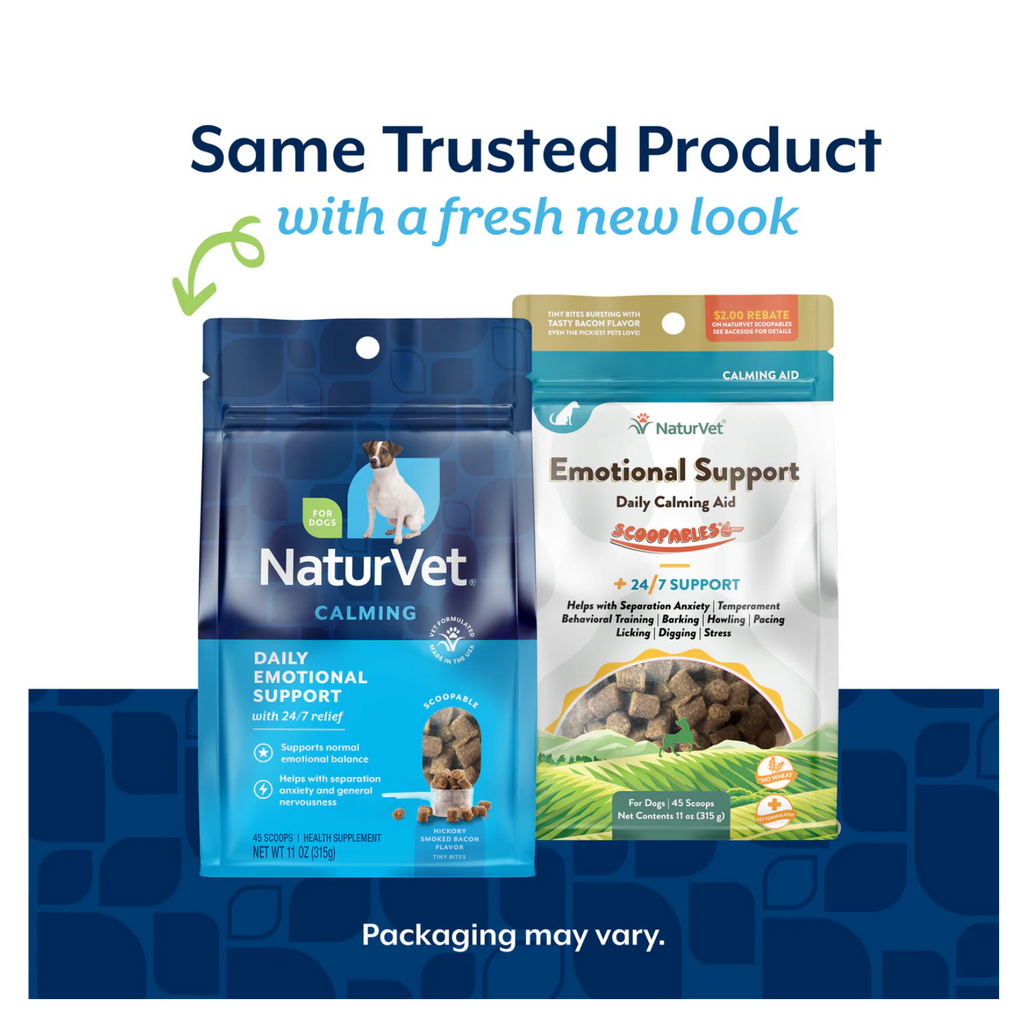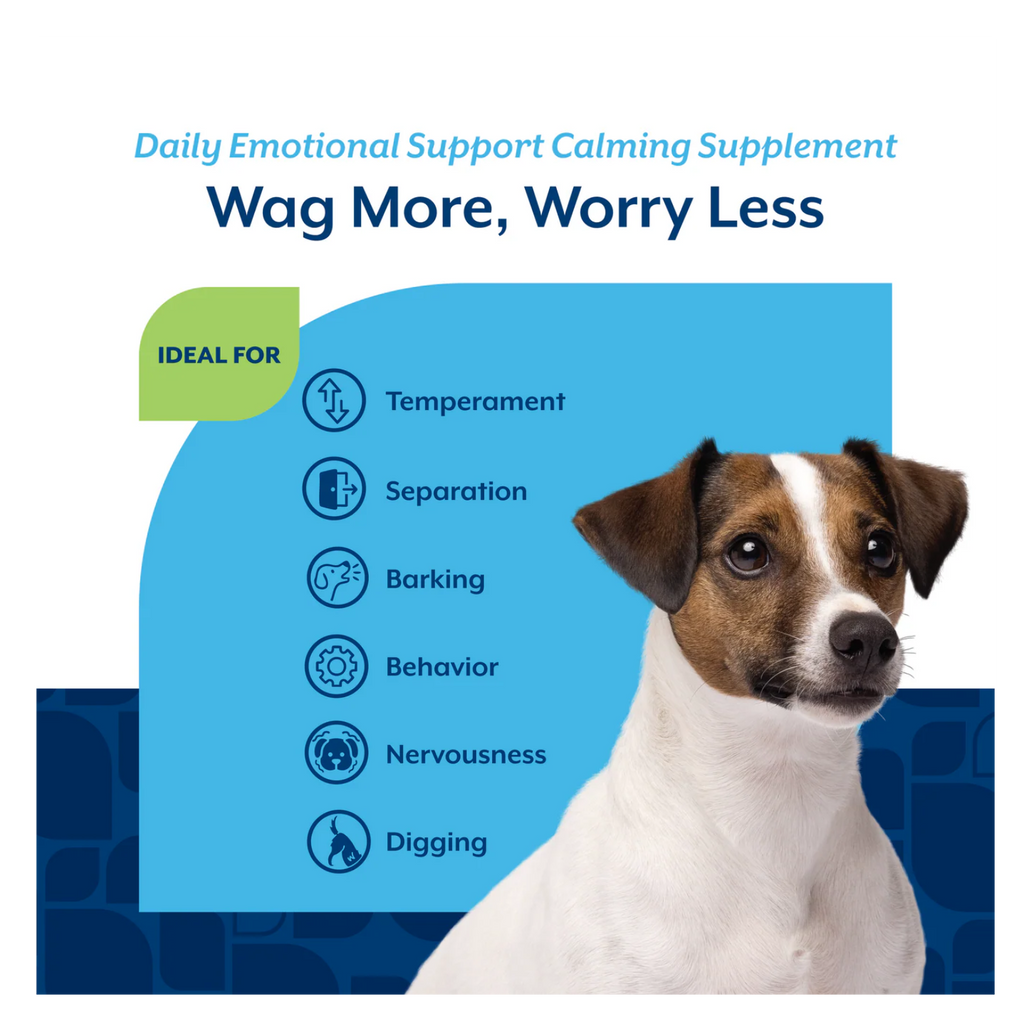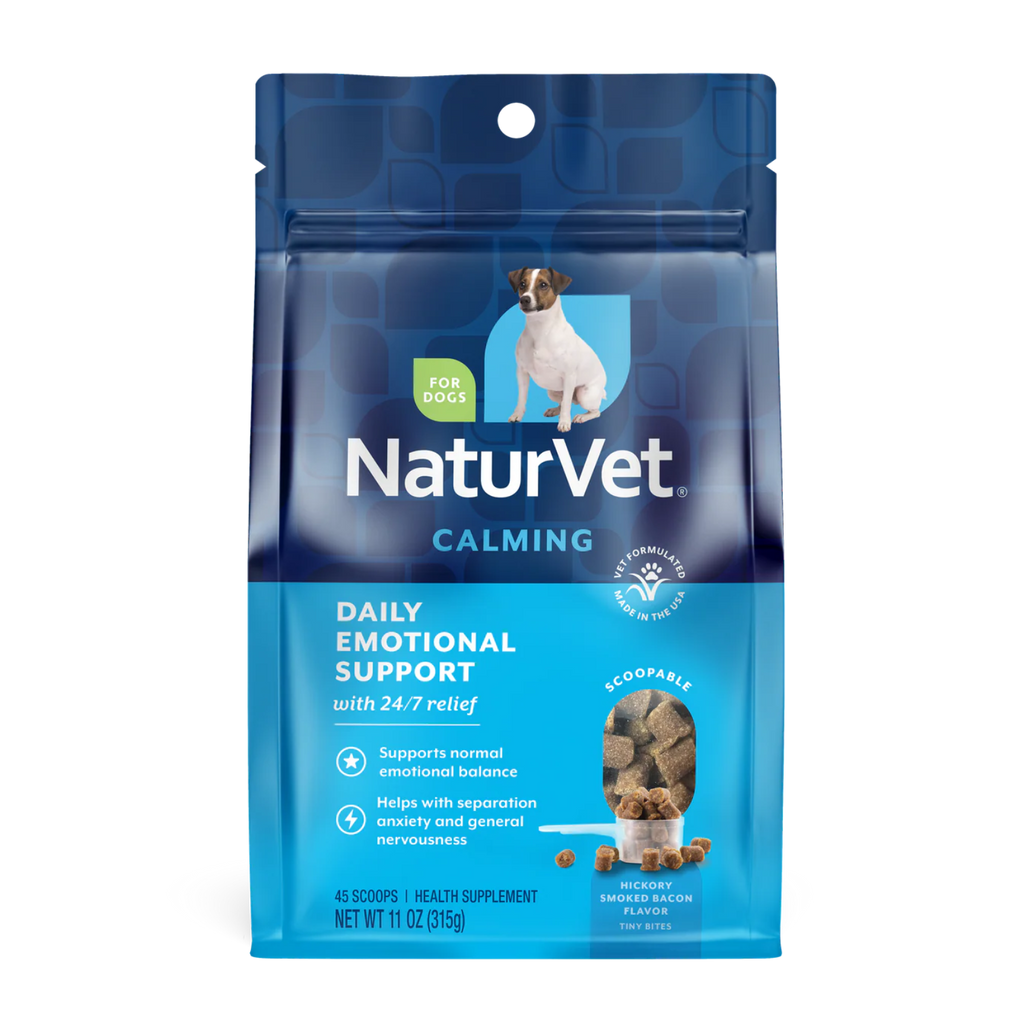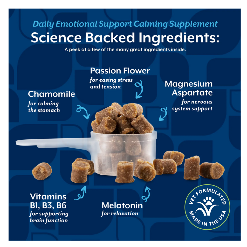 Help your pup find daily balance with our veterinarian formulated Daily Emotional Support Calming Scoopable Tiny Bites for stress, separation anxiety, and nervous habits. With a gentle blend of Melatonin, Magnesium, Passion Flower, Chamomile, and B-Vitamins, they promote relaxation, help ease stress and tension, and support sensitive tummies. The hickory-smoked bacon flavor turns emotional support into a moment of joy. For use in dogs only. Veterinarian formulated for use in dogs over the age of 12 weeks. Contains botanicals to help promote normal emotional balance. With B-Vitamins to support calm behavior, a blend of Magnesium Aspartate, Passion Flower, and Melatonin to help promote restful relaxation, and Chamomile to support sensitive stomachs.