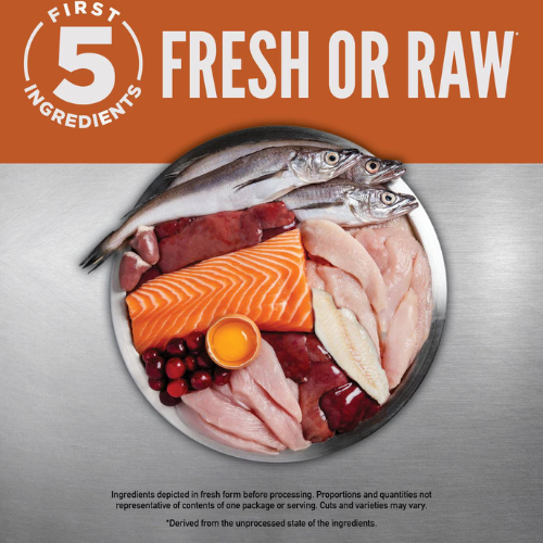 Chicken, Salmon, Turkey, Whole Whiting, Haddock, Dehydrated Turkey, Dehydrated Chicken,Dehydrated Herring, Dehydrated Chicken Liver, Dehydrated Egg, Whole Red Lentils, Whole Pinto Beans,Chicken Giblets (Liver, Heart, Gizzard), Eggs, Turkey Giblets (Liver, Heart, Gizzard), Chicken Fat, Wholegreen Lentils, Whole Navy Beans, Whole Chickpeas, Whole Peas, Natural Chicken Flavor, Pollock Oil, Driedapple Pomace, New Zealand Green Mussels, Dried Kelp, Whole Butternut Squash, Whole Pumpkin,Vitamin E Supplement, Salt, Zinc Proteinate, Mixed Tocopherols (Preservative), Whole Apples, Wholecarrots, Whole Pears, Whole Zucchini, Thiamine Mononitrate, Niacin, Riboflavin, Calcium Pantothenate,Pyridoxine Hydrochloride, Folic Acid, Vitamin B12 Supplement, Copper Proteinate, Beet Greens, Kale,Spinach, Turnip Greens, Whole Cranberries, Whole Blueberries, Dried Chicory Root, Turmeric, Sarsaparillaroot, Althea Root, Rosehips, Juniper Berries, Dried Bacillus Coagulans Fermentation Product, Citric Acid(Preservative), Rosemary Extract.