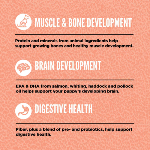 This puppy dog food contains EPA and DHA from salmon, whiting, haddock, and pollock oil to promote brain development.