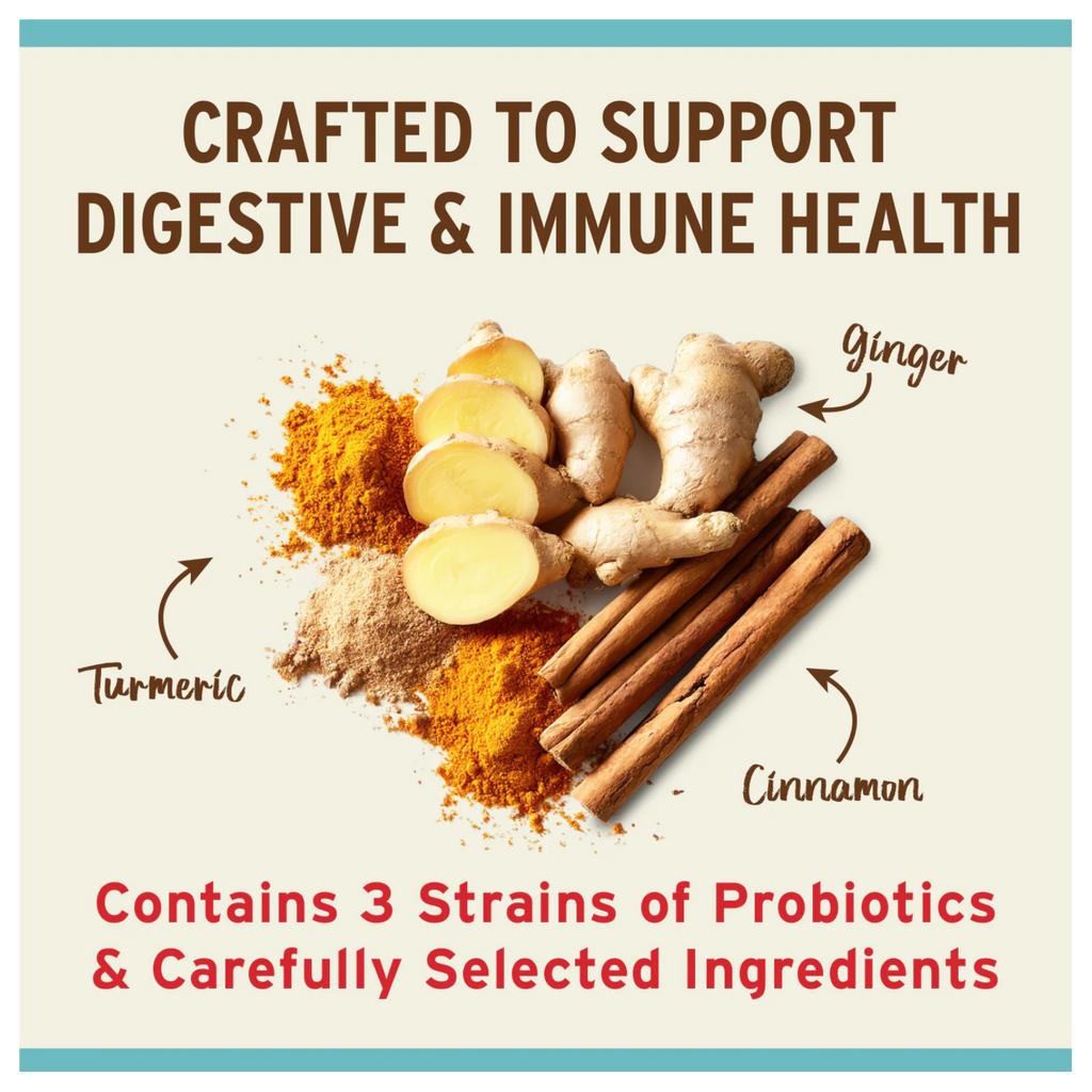 - Includes probiotics for digestive and immune support.