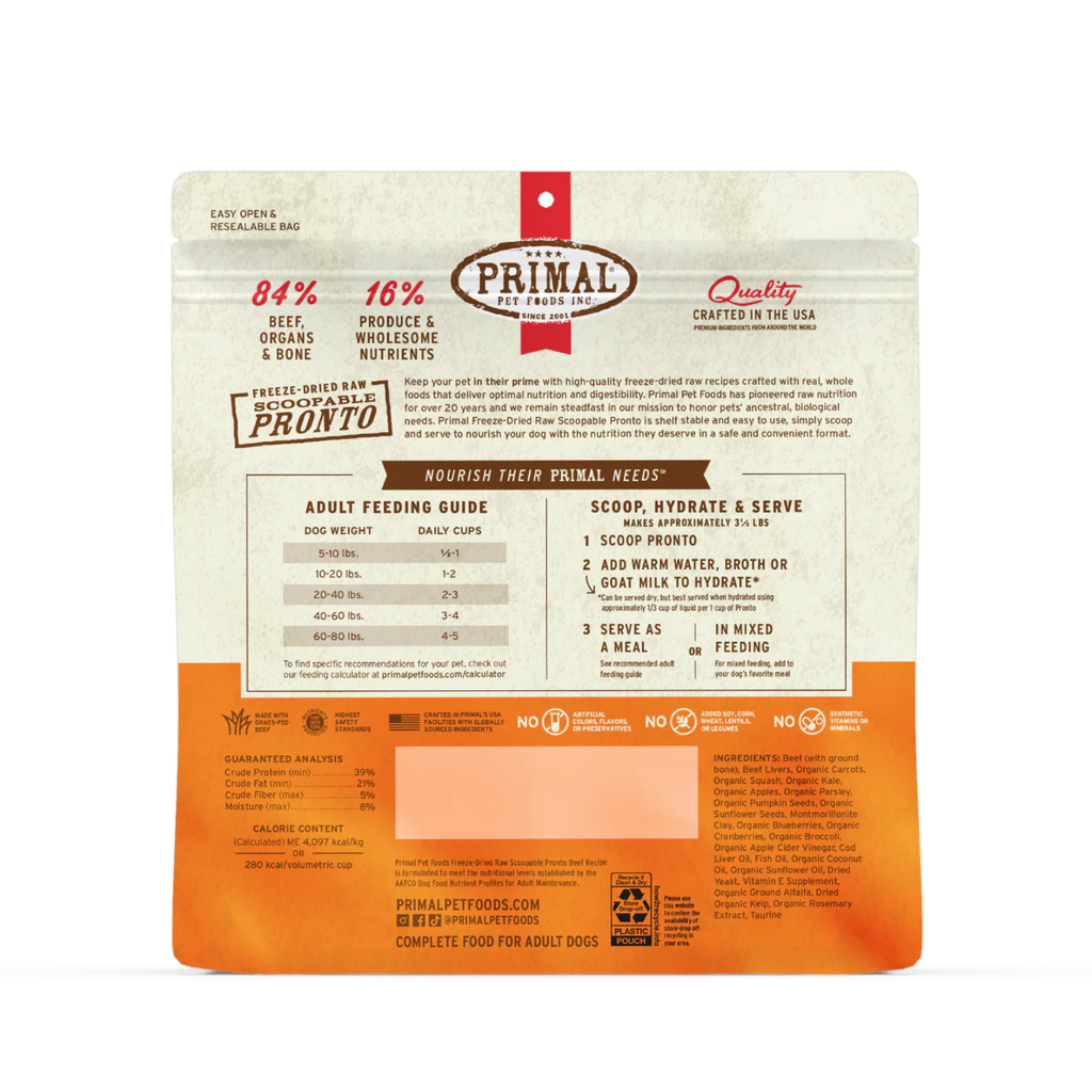 Nourish your pup’s hungry body with Raw Pronto Beef Recipe Dog Freeze-Dried Food from Primal! Made in the USA with high-quality proteins, this freeze-dried dog food provides a 100% complete and balanced raw food diet for adult pups. It’s crafted with grass-fed, antibiotic-free beef raised on USDA-certified organic fruits and vegetables without the use of steroids or added hormones. Conveniently packaged and dinner-ready in seconds, this dog feed’s highly-digestible formula maximizes nutrient absorption to help support healthy weight, skin, eyes, oral health and more.