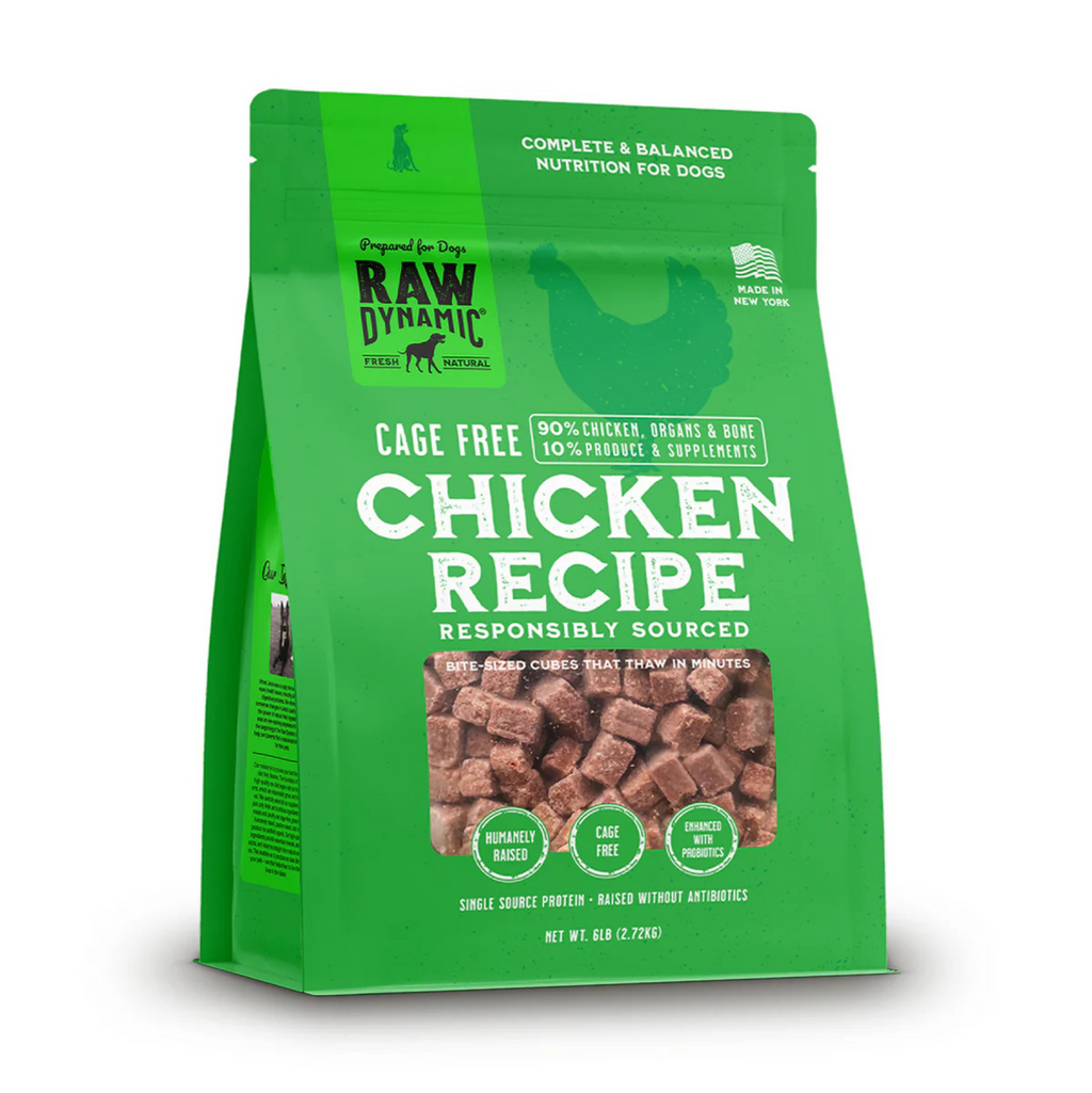 This complete and balanced frozen diet is designed to be left in the freezer until you're ready to feed your dog. The cube shaped bites allow for quick thaw time, making raw food as easy as scoop and serve. At Raw Dynamic we like to keep things simple so we stick to the basics in our dogs formulas using raw human grade chicken, organic produce, beneficial vitamins and probiotics.