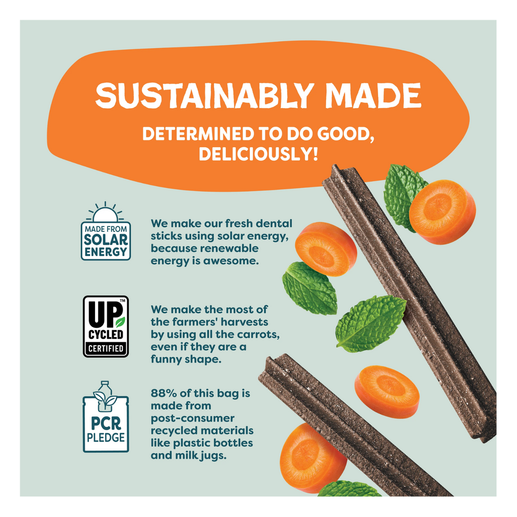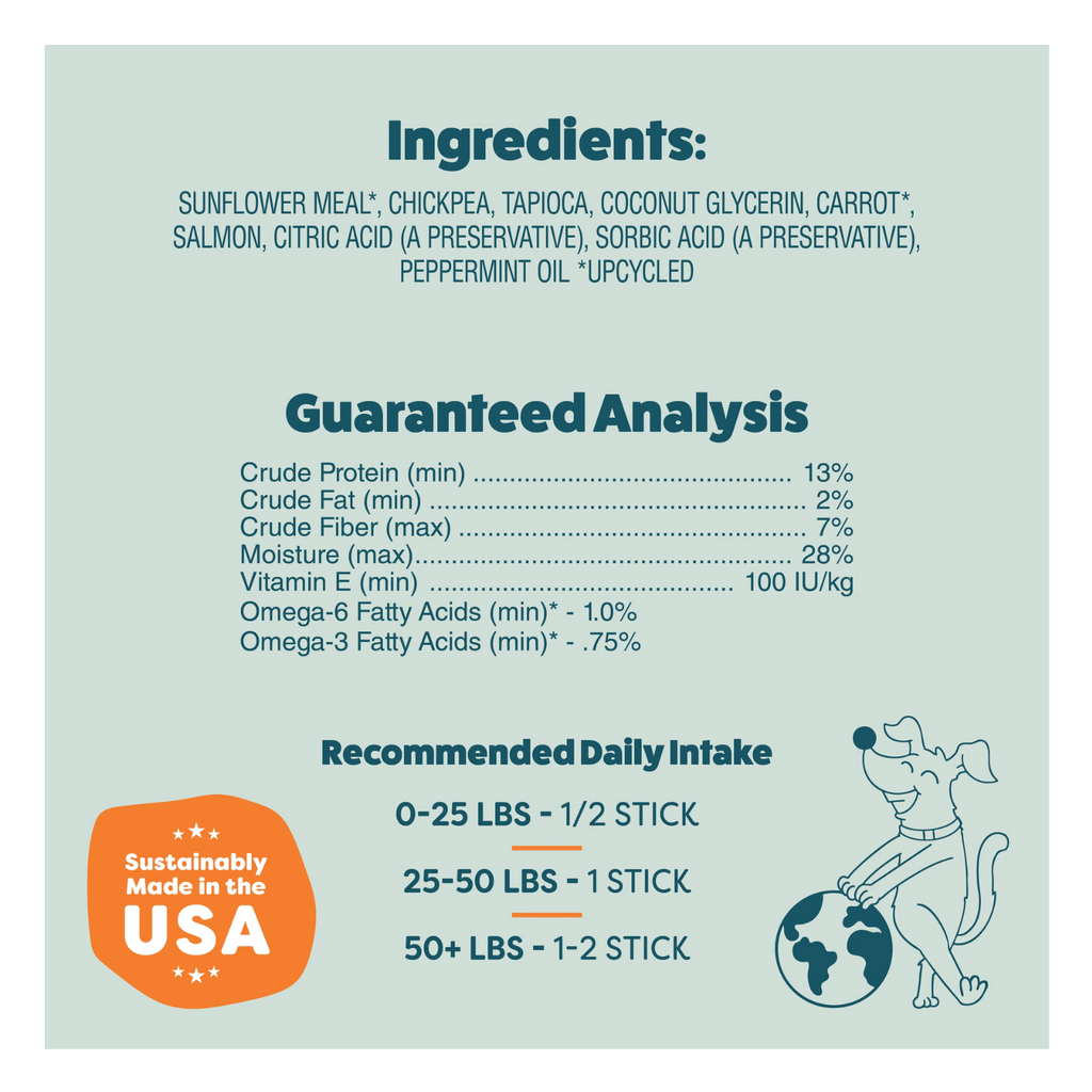 Ingredients: Sunflower meal*, chickpea, tapioca, coconut glycerin, carrot*, salmon, citric acid (a preservative), sorbic acid (a preservative), peppermint oil