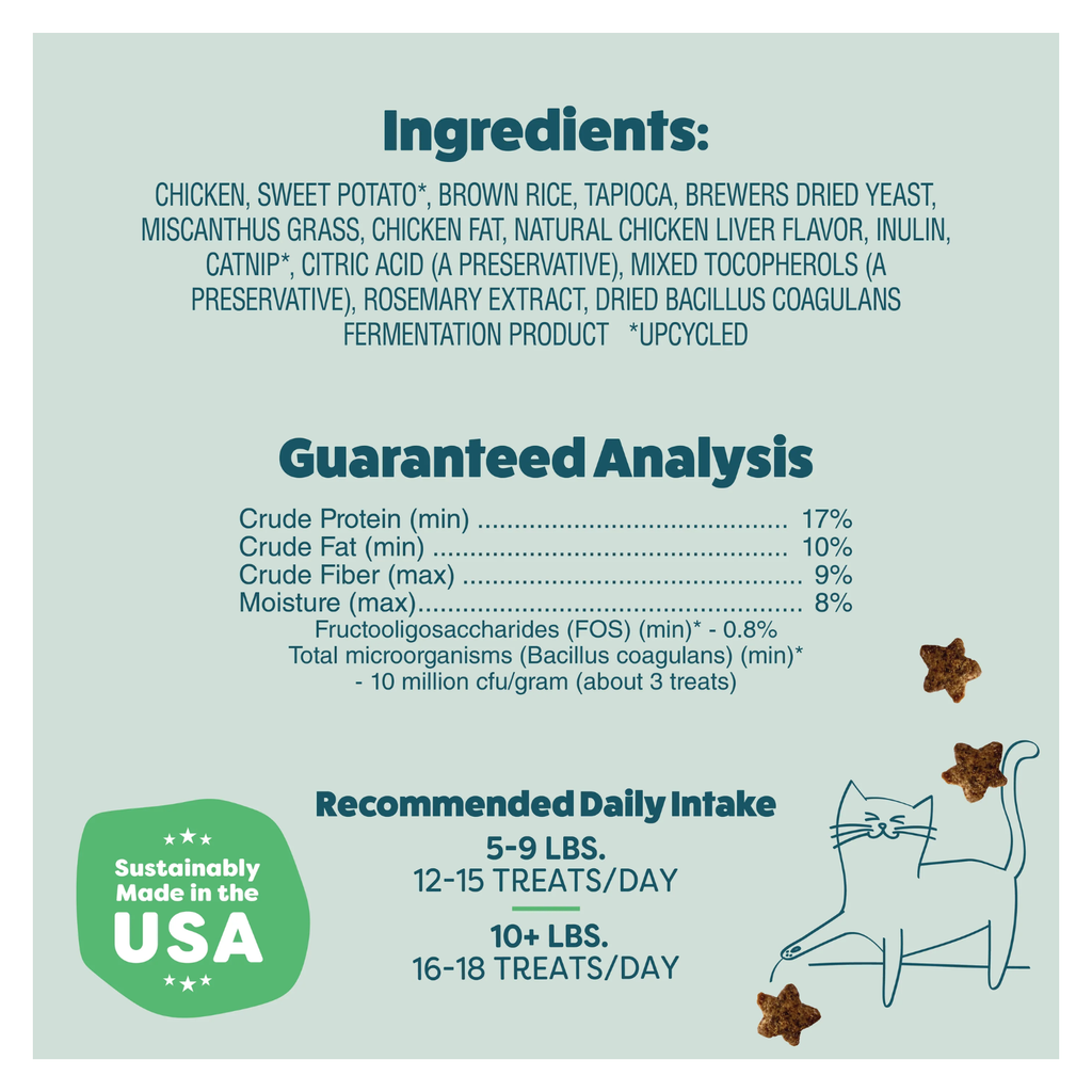 Chicken, sweet potato*, brown rice, tapioca, brewers dried yeast, miscanthus grass, chicken fat, natural chicken liver flavor, catnip, inulin, sorbic acid (a preservative), mixed tocopherols (a preservative), rosemary extract, dried bacillus coagulans fermentation product