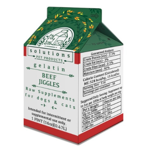 Solutions Pet Products gelatin is thick with natural collagen and elastin. Using Solutions Pet Products sustainably sourced gelatin can support healthy skin, coat, joints, nails, and gut.