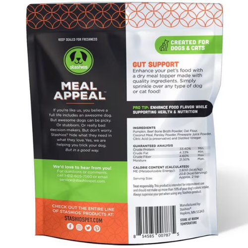 Picky pets have met their match! Stashios Meal Appeal Beef & Gut Support Dog & Cat Treat is a dry meal topper crafted with love for dogs and cats. Enhance your pet’s food while supporting their gut health and nutrition. Meal Appeal Gut Support is made with real pumpkin, limited ingredients, and beef bone broth for an irresistible flavor boost. Make mealtime special with a dry food topper made with quality US ingredients. To use, simply sprinkle Meal Appeal over any type of dog or cat food (sold separately).