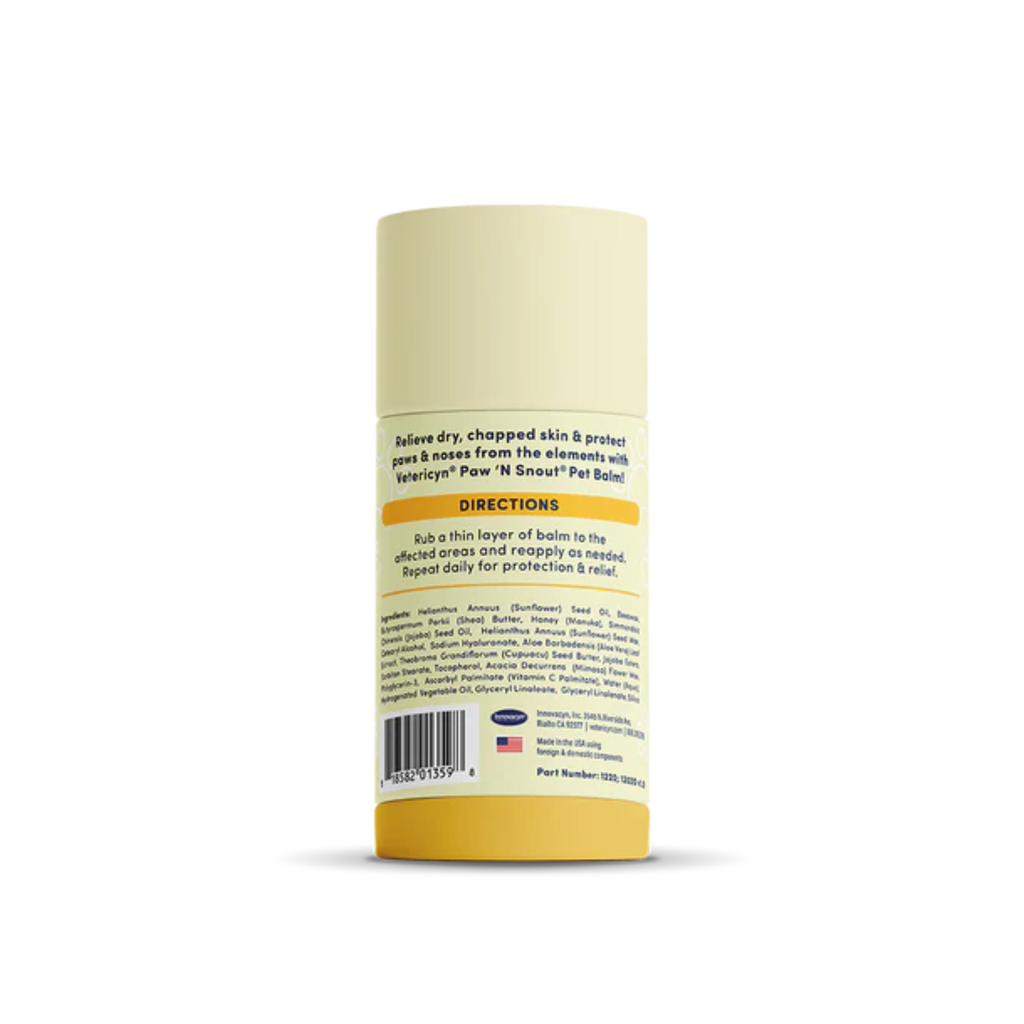 Vetericyn Paw 'n Snout Pet Balm is formulated with a blend of clinically proven ingredients to protect an relieve dry, cracked, and chapped skin on sensitive areas like paws, noses, and elbows. Infused wih manuka honey, aloe vera, and hyaluronic acid, it delivers hydration and repair while creating a barrier against harsh environmental elements. Protects, hydrates, and soothes dry, cracked paws, noses, and calloused skin. Manuka honey reduces inflammation and nourishes damaged areas. Aloe Vera soothes and moisturizes sensitive skin. Hyaluronic acid helps keep skin hydrated. Safe for all animals with no toxic ingredients.